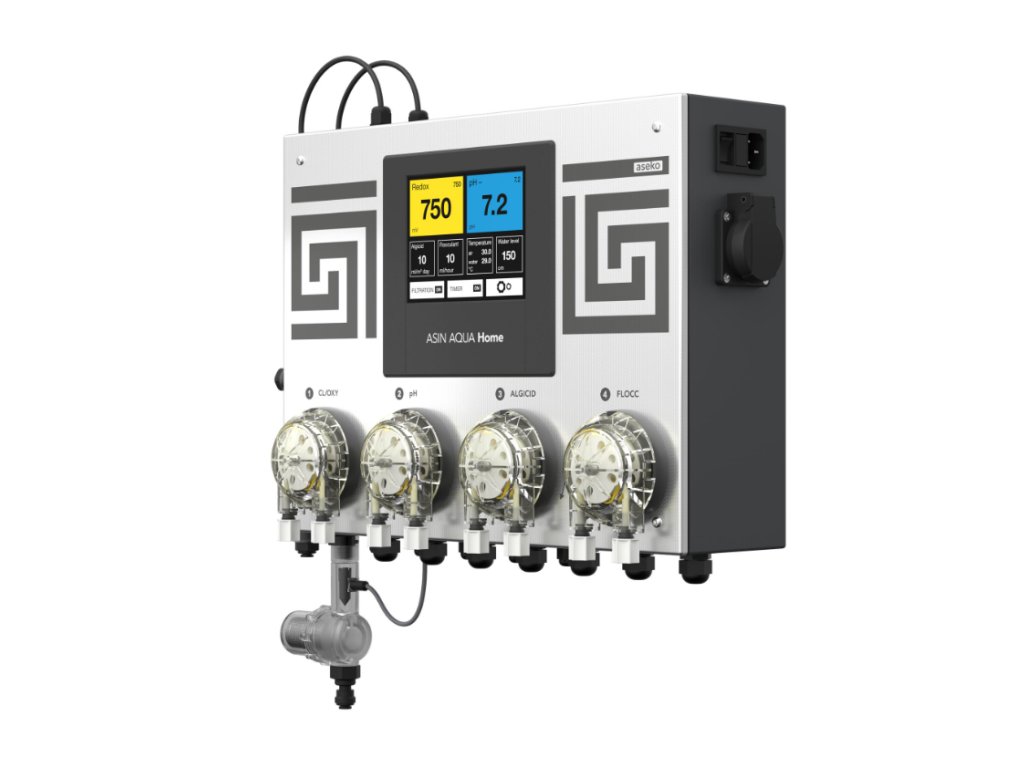 Asin Aqua Home Redox tvorí kompaktný celok skladajúci sa z riadiacej jednotky, elektródy na meranie pH, redox a štyroch dávkovacích čerpadiel s výkonom 60 ml/min. Stavové hodnoty chémie sa zobrazujú na vstavanom dotykovom displeji. Automatiky Asin Home sú štandardne vybavené aj pomocným relé na pripojenie bazénovej filtrácie s príkonom až 1kW a snímačom teploty na kontrolu a zobrazovanie teploty vody v bazéne.