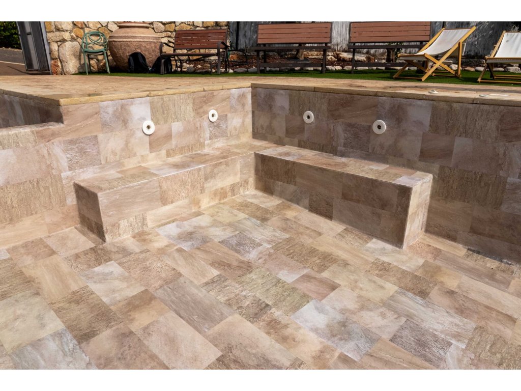 Zlatý dizajn vyžaruje teplo a luxus, inšpirovaný nadčasovou krásou zlatého kameňa. Jeho dlaždice s rozmermi 40 × 20 cm vytvárajú slnečný, prirodzený efekt , ktorý premení váš bazén na žiarivú svätyňu, kde voda odráža trblietavé zlaté tóny a pocit čistej elegancie.