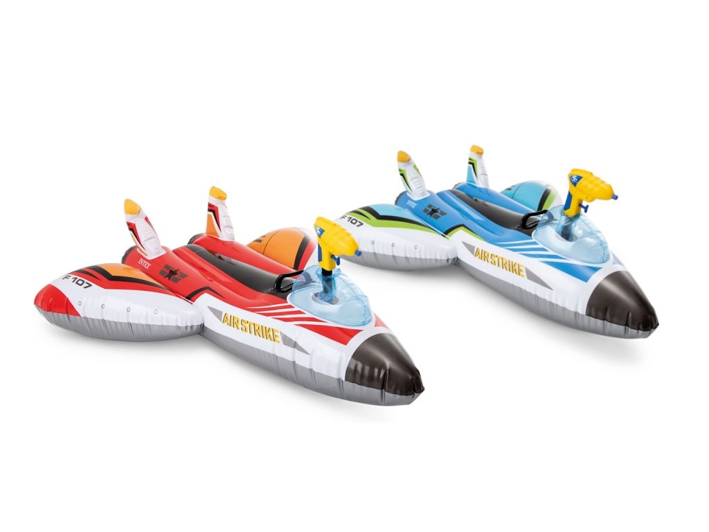 Nafukovacie lietadlo/stíhačka je skvelý doplnok pre letné dni. Má zabudovanú vodnú pištoľ a jeden odolný držiak pre bezpečnosť. Originálna detská hračka do vody. Vyrobená je z kvalitného, testovaného vinylu spĺňajúceho najprísnejšie bezpečnostné normy na spracovanie a použité materiály.