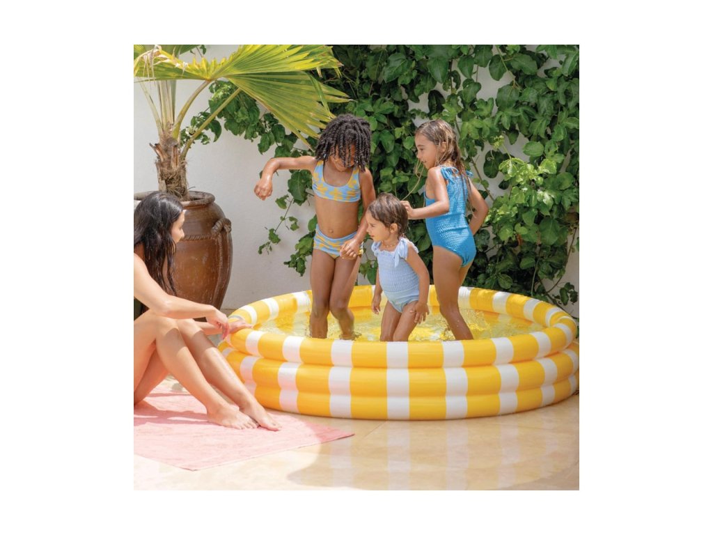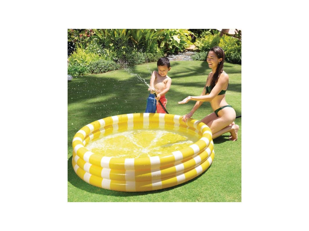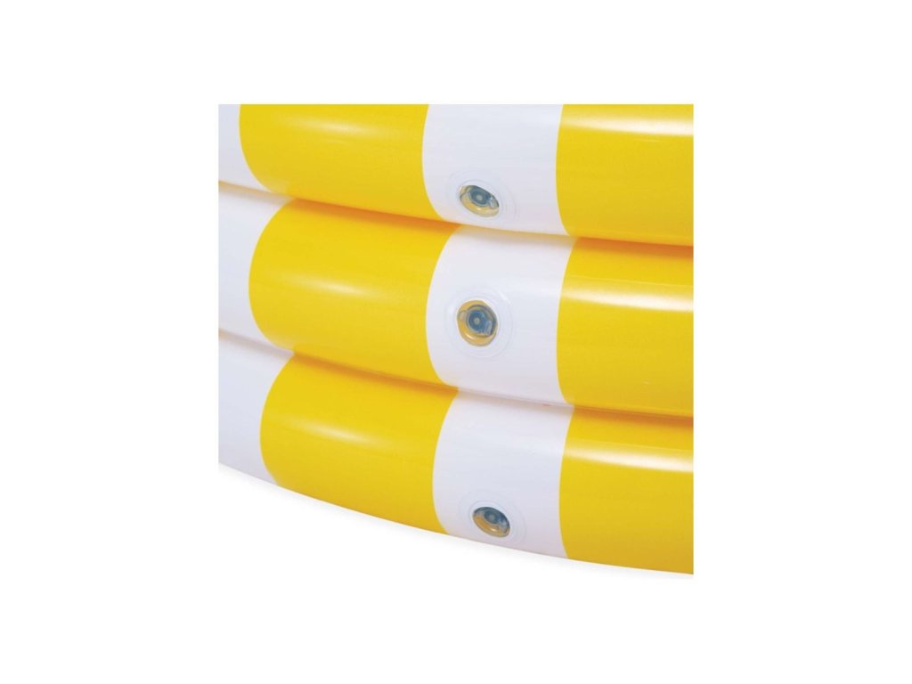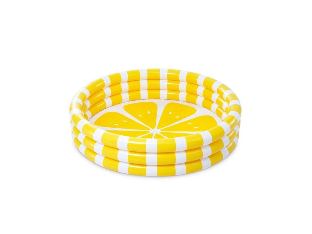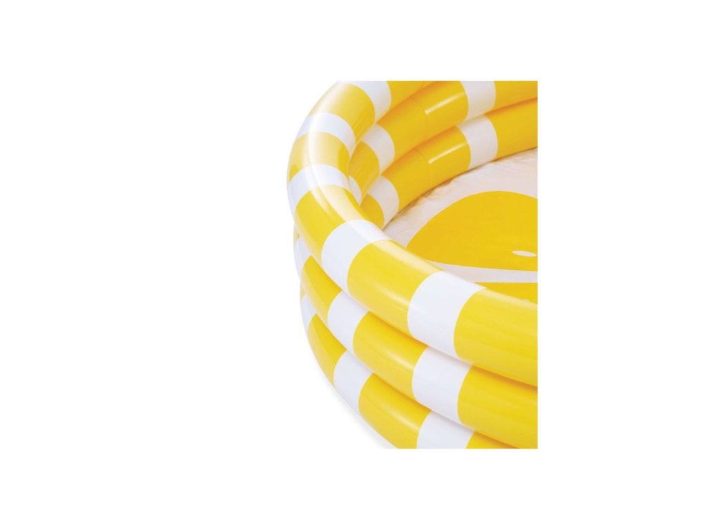 Klasický nafukovací detský bazén vyrobený z pevného vinylového materiálu, ktorého steny tvoria tri nafukovacie kruhy v štýle citrónu.