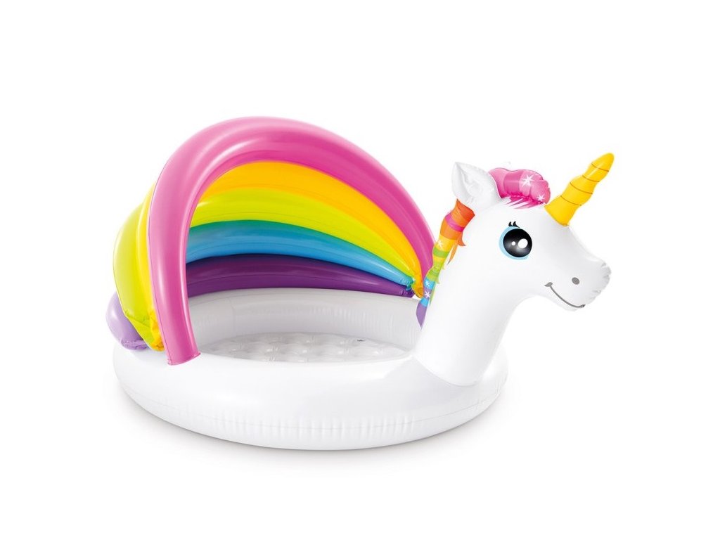 Nafukovací bazén pre bábätká so slnečníkom v dizajne dúhového jednorožca sú ideálnym priestorom, kde môže dieťa stráviť leto v pohode a chránené pred slnkom pri zábave a hre.