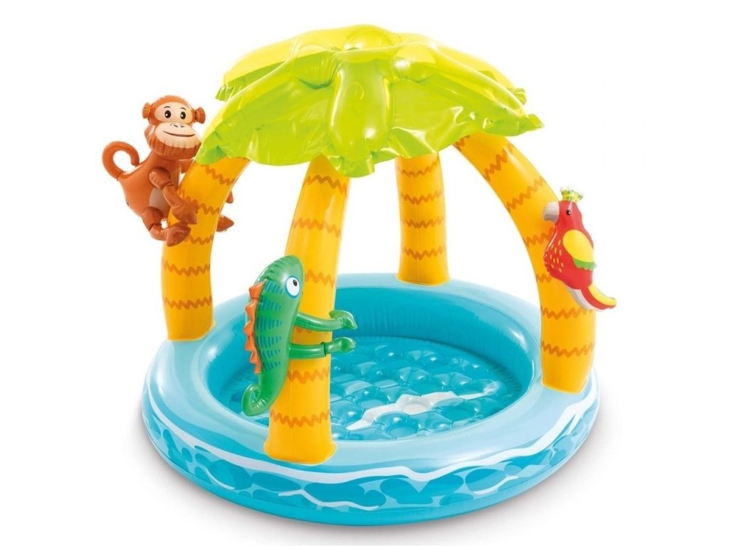 Nafukovací detský bazénik so slnečníkom v tvare palmy pre deti od 1 do 3 rokov. Bazénik má mäkké nafukovacie dno. Súčasťou sú aj tri malé nafukovacie zvieratká – papagáj, opička a leguán.