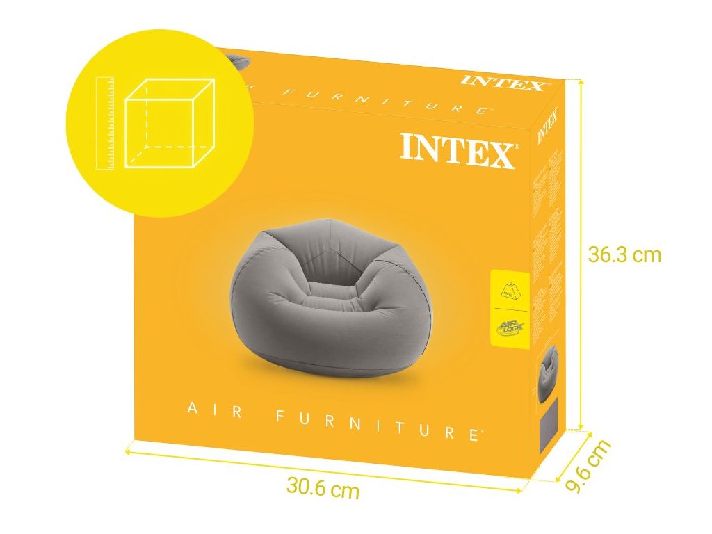 Pozerajte televíziu, čítajte knihu alebo si jednoducho oddýchnite v pohodlnom kresle Intex z kolekcie Beanless Bag. Moderný vzhľad pufu sa hodí do každého interiéru. Produkt Air Lock - bol pred opustením továrne testovaný na vzduchotesnosť. Je potiahnutý mäkkým materiálom, vďaka čomu je mimoriadne príjemný na dotyk. Má tvarované sedadlo a prispôsobené a stabilné operadlo – čo zvyšuje pohodlie pri používaní. Perfektný produkt pre akúkoľvek vytúženú relaxáciu.