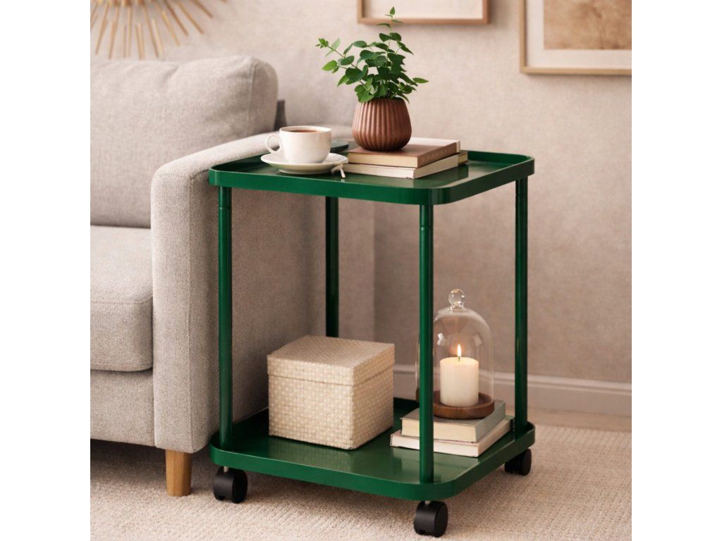 Menší ako konferenčný stolík, no stále dostatočne veľký na to, aby ste si odložili šálku čaju, kávu, koláčik, rozčítanú knihu alebo ovládač. Šikovný, praktický, nadčasový, taký je príručný stolík H&S. Má jednoduchú konštrukciu vyrobenú z kovu v žltom a zelenom prevedení. Ľahko sa s ním manipuluje vďaka kolieskam. Stolík je dodávaný v demonte.