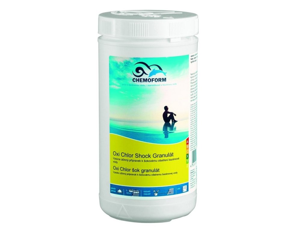 - Ideálna hodnota pH: 7,0 - 7,4. Ideálna hodnota chlóru: 0,6 - 1,0 mg/l. Kyslíkovo-chlórová kombinácia má extrémne vysokú dezinfekčnú a oxidačnú účinnosť, je vhodná do všetkých druhov bazénov a pre všetky typy úpravy vody. Prípravok odporúčame na ošetrenie vody v prípade neočakávaných výkyvov v jej kvalite. Veľmi účinne likviduje ogranické aj anorganické znečistenia bazéna. Po aplikácii prípravku použite niektorý z vločkovačov pre dosiahnutie krištáľovo čistej vody. Počas vločkovania prepierajte filtráciu. K šokovému dávkovaniu dávkujte cca 80 - 100 g na každých 10 m³ bazénovej vody. Prípravok najprv rozmiešajte vo vhodnej nádobe s vodou. Roztok rozlievajte rovnomerne pozdĺž okrajov bazéna. Nikdy nemiešajte s inými chemikáliami.