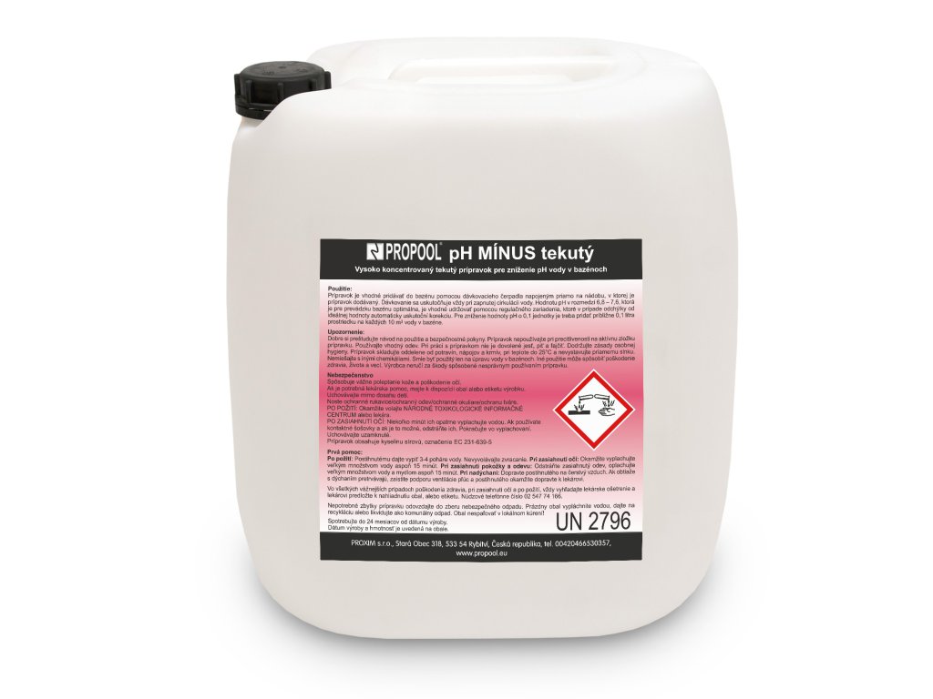 Vysoko koncentrovaný tekutý prípravok na zníženie pH vody v bazénoch. Pre zníženie hodnoty pH o 0,1 jednotky je treba pridať približne 0,1 litra prostriedku na každých 10 m3 vody v bazéne.