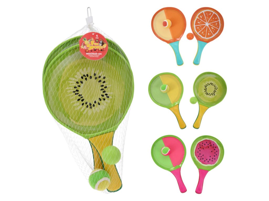 Plážový tenis a hra s loptičkou na suchý zips. Súprava sa skladá z 2 rakiet a 2 loptičiek. Jedna strana sa dá použiť na plážový tenis, druhá na chytanie loptičky na suchý zips. Rakety majú rozmery cca 34 x 20 cm.