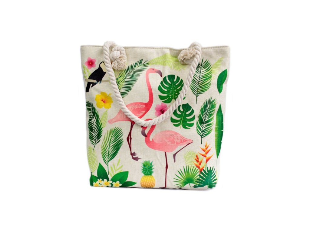 Priestranná plážová taška - Plameniak, do ktorej zbalíte všetko potrebné! Skvelá nielen k vode, ale aj na nákupy, uzatvárateľná na zips, s vnútornými vreckami. Popruhy sa veľmi príjemne držia, ich dĺžka je akurát pre nosenie v ruke alebo na ramene. Vyberte si z rôznych vzorov a farieb.
