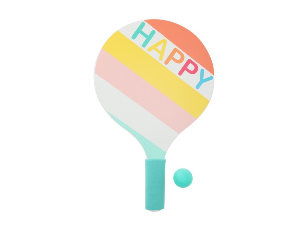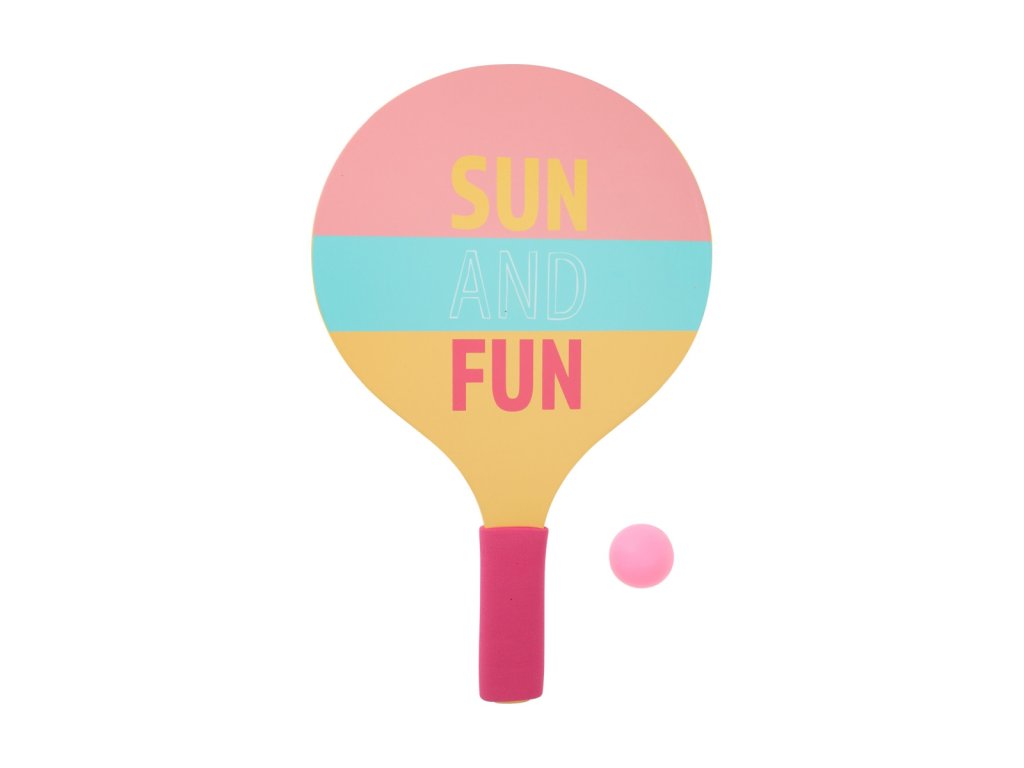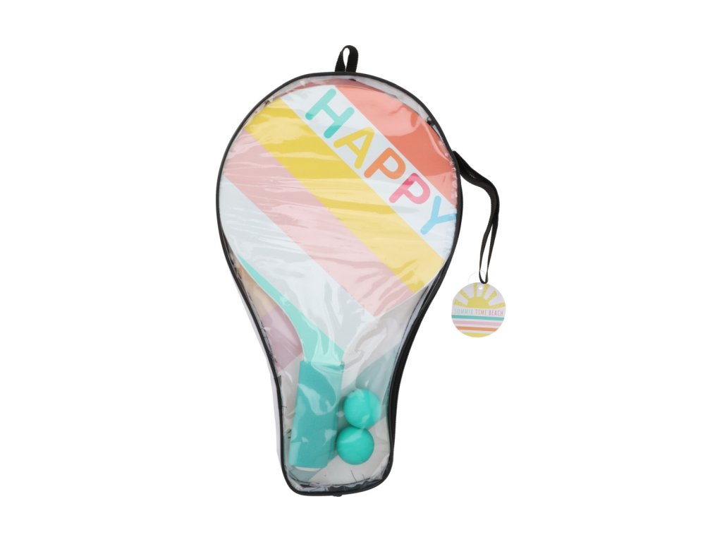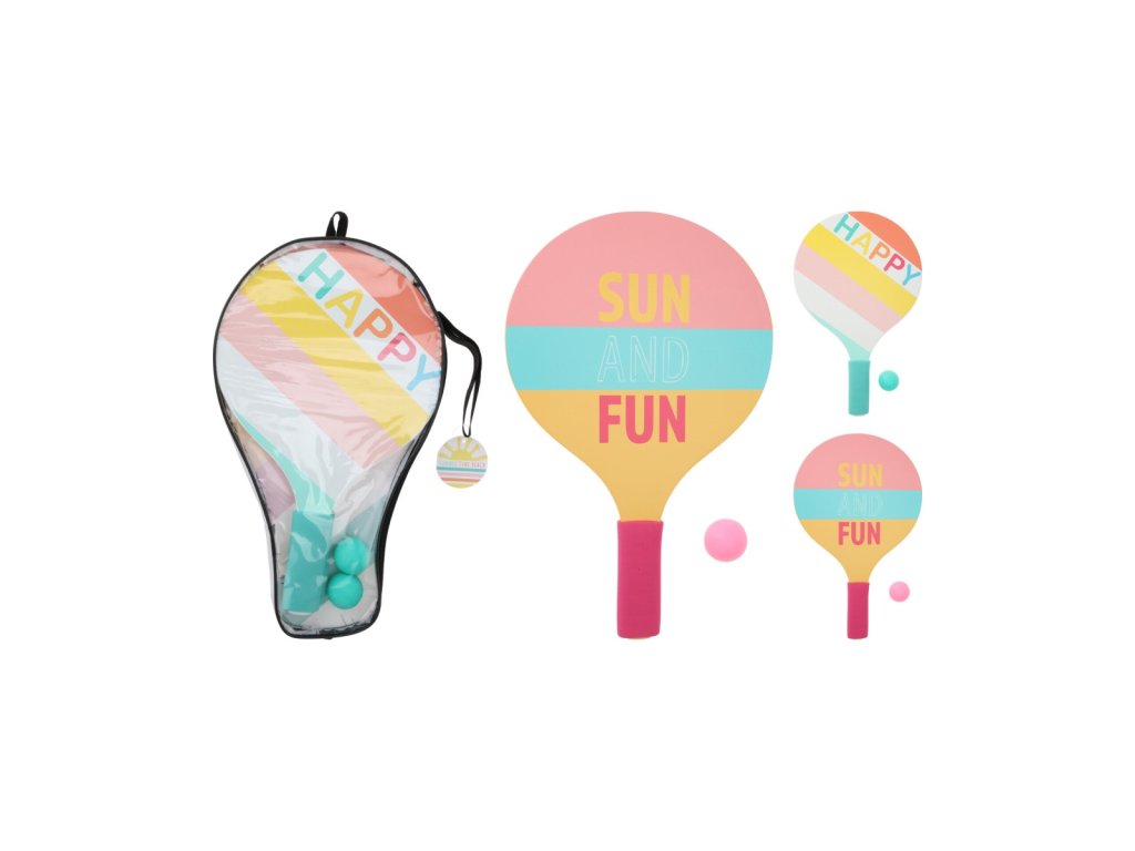 Nezabudnite si na letnú dovolenku pribaliť tieto plážové rakety Sunset! Táto sada 2 rakiet a 3 loptičiek v priehľadnom puzdre s hravým dizajnom naplní vaše dni zábavou. Neodporúča sa používať v styku s vodou, pretože by mohla spôsobiť poškodenie.