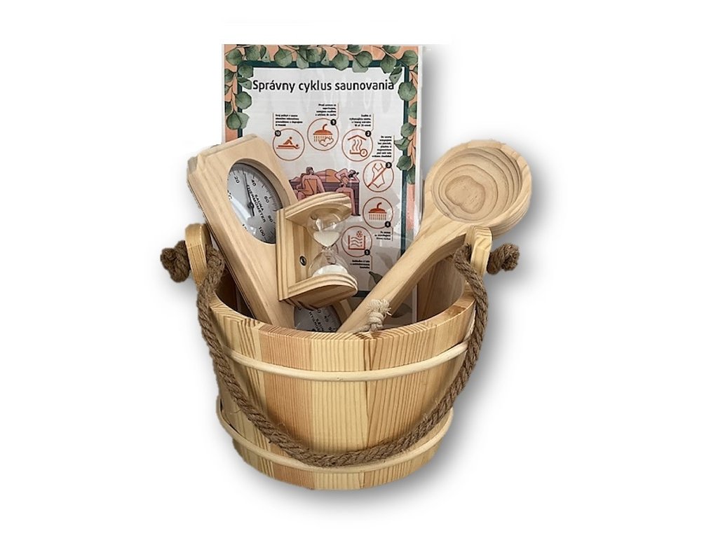 Set zladených doplnkov do sauny. Všetko, čo potrebujete k saunovaniu, je usporiadané v jednom balení.