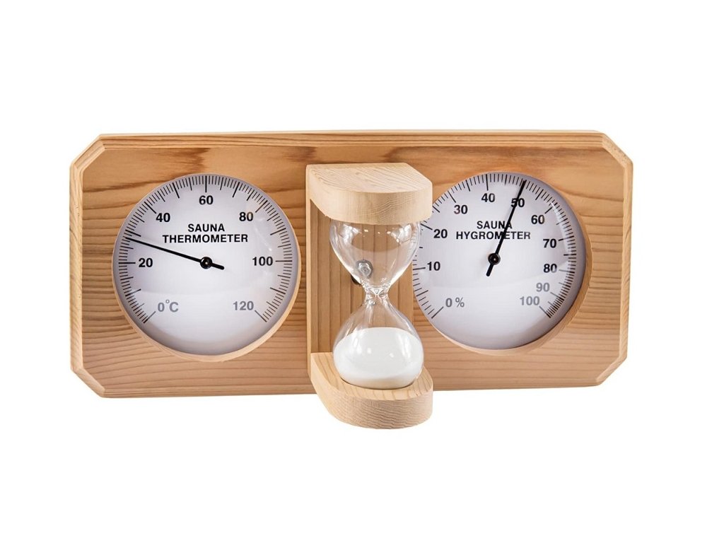 Kombinovaný saunový teplomer a vlhkomer na meranie teploty a vlhkosti v saune s integrovanými presýpacími hodinami.
