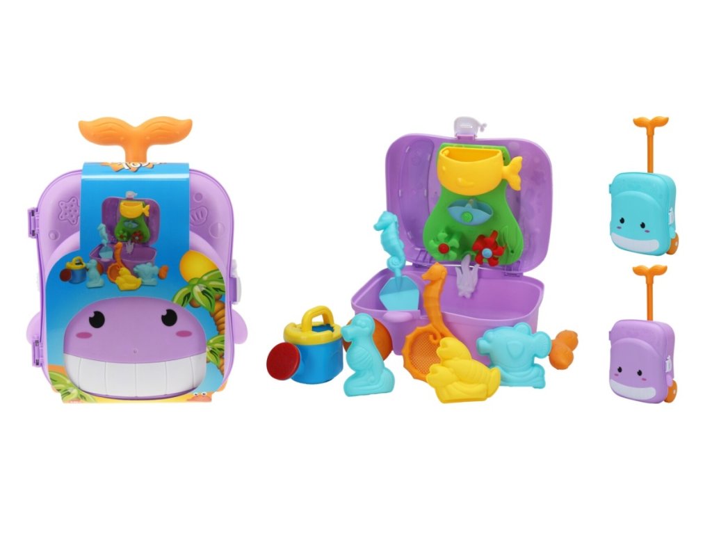 Nevšedný kufrík v tvare roztomilej veľryby obsahuje množstvo rôznych hračiek do piesku! Kompaktná veľkosť kufra vám umožní vziať si ho so sebou na pieskovisko, ihrisko, dvor, výlet alebo dlhú cestu. Kufor je ľahký, má kolieska a výsuvnú rúčku, ktorá umožňuje dieťaťu nosiť hračku samostatne. Hračky si môžete zobrať so sebou aj ako príručnú batožinu do lietadla. Kufor s rozmermi: 33,5 x 26 x 14 cm je perfektnou alternatívou príručnej batožiny pre dieťa!