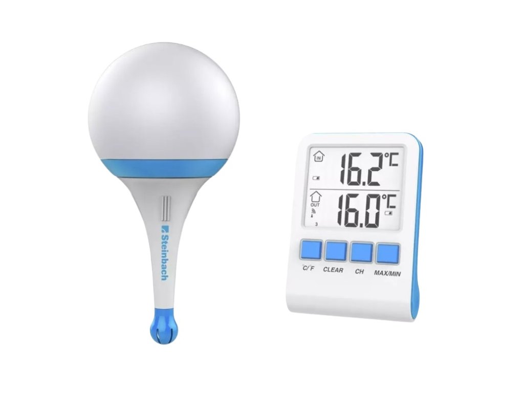 So solárnym guľovým svetlom s digitálnym rádiovým teplomerom od Steinbachu máte vždy dokonalý prehľad o teplote vášho bazéna. Solárne poháňané guľôčkové svetlo svojou zmenou farby vytvára v bazéne mimoriadne príjemnú atmosféru a náladu. Plavák teplomeru je osadený LED svetlom, ktoré sa samo pri zotmení rozsvieti. Dobíjanie LED svetla je zabezpečené pomocou solárneho panelu na tele plaváku. Displej bezdrôtového teplomera zobrazuje okolitú teplotu a teplotu vody v °C/°F. Zabudovaný súmrakový senzor automaticky zapína a vypína svetlo.