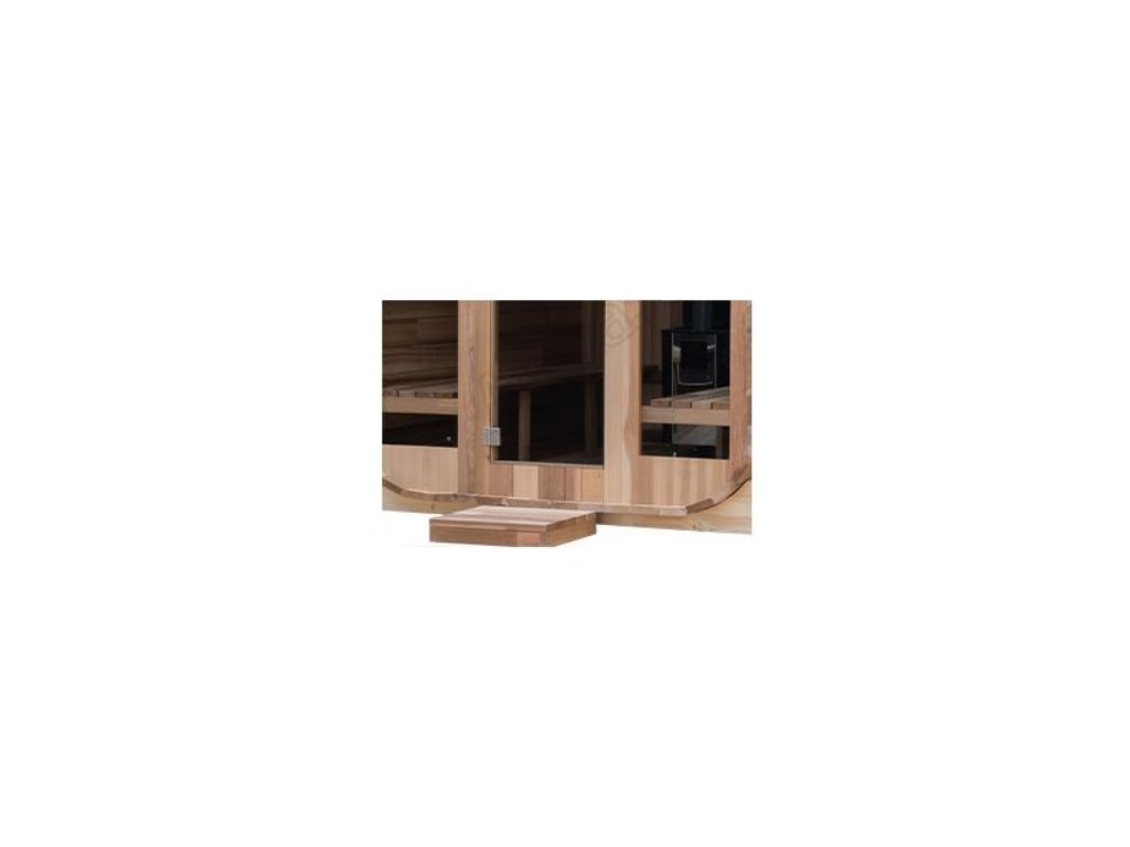 - Spodok sauny je podopretý dvoma drevenými podstavcami, ktoré zaisťujú nielen stabilitu, ale plní aj dekoratívnu úlohu a zvyšujú vizuálny efekt sauny.