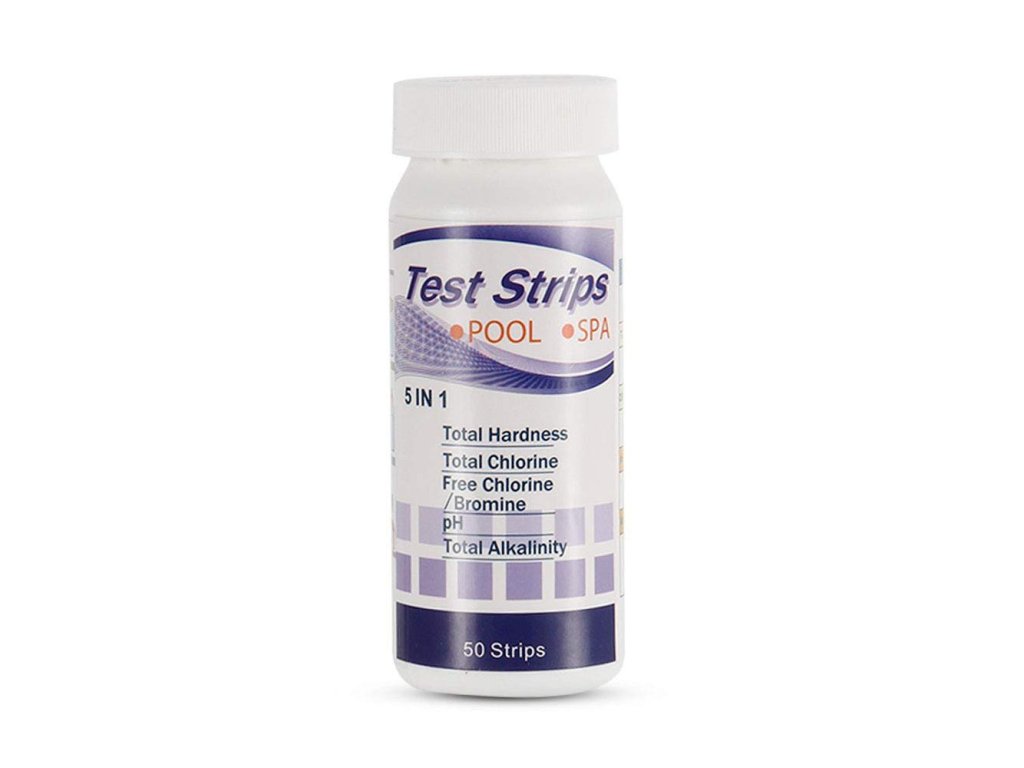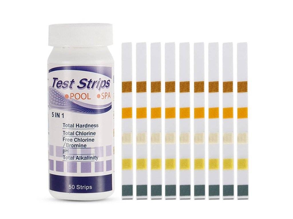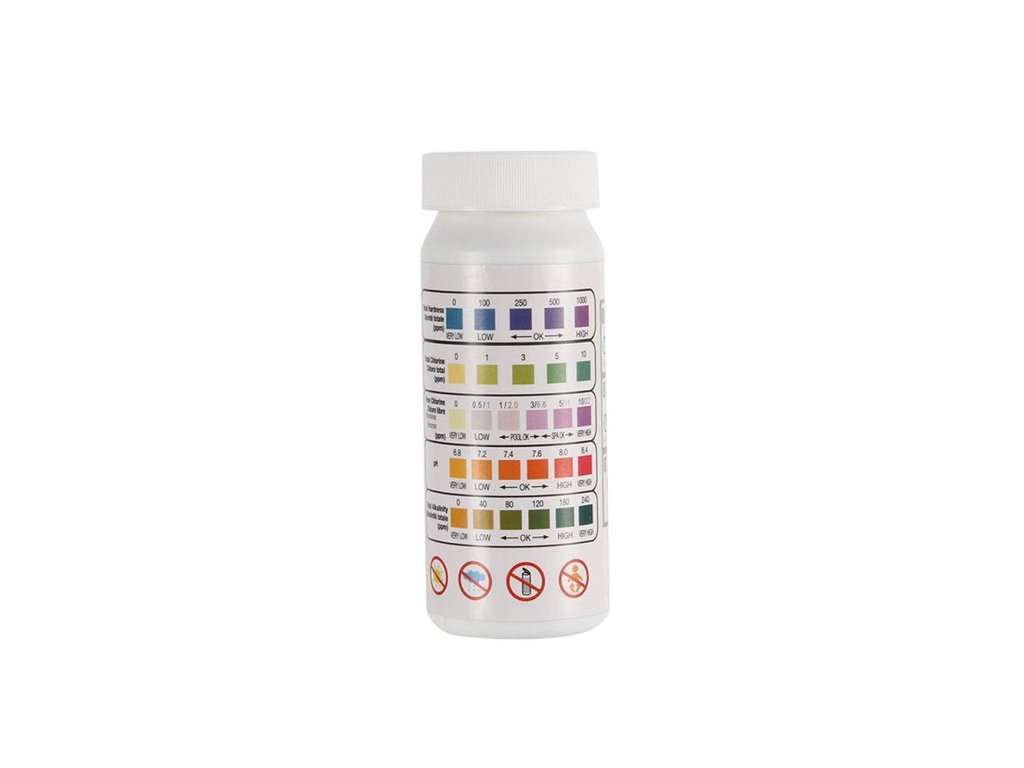 Testovacie prúžky na meranie pH, celkového chlóru, voľného chlóru/brómu, alkality a tvrdosti vody, ktoré sú potrebné na zaistenie hygienickej nezávadnosti vody.