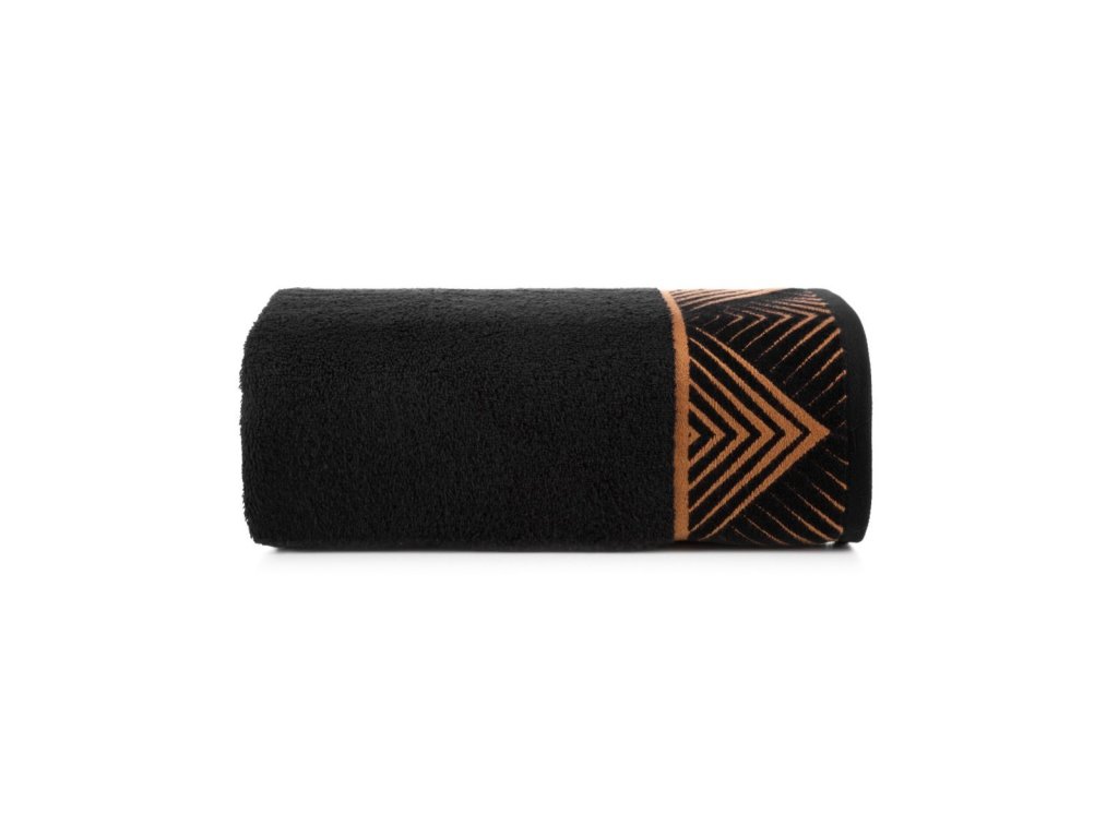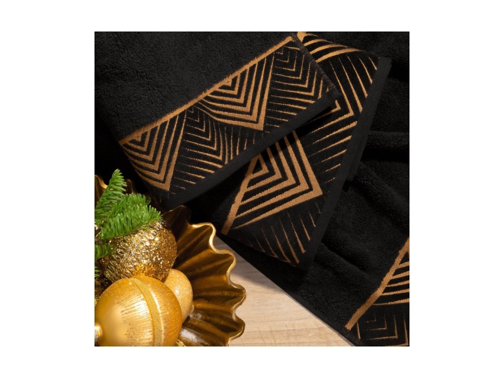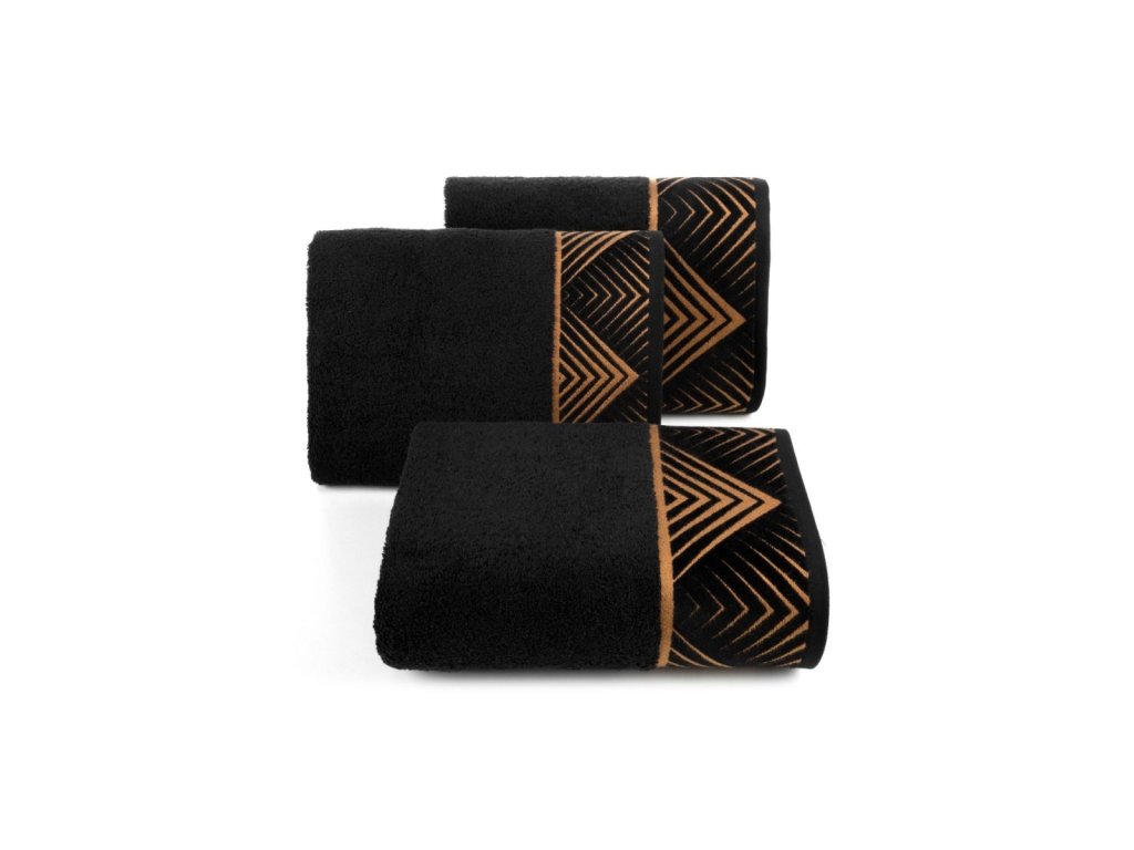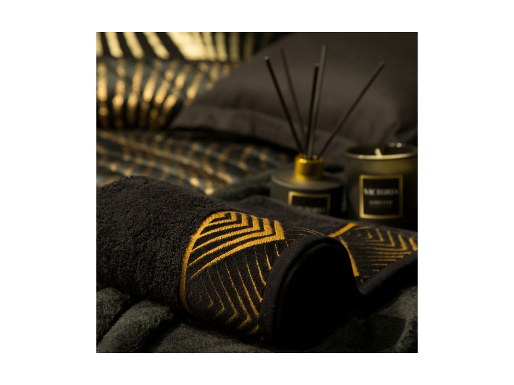 Exkluzívny uterák z kolekcie VICTORIA , zdobený zamatovým okrajom s geometrickým vzorom v zlatej farbe, nechá vyniknúť vašu kúpeľňu. Osuška z nadýchanej froté bavlny, veľmi jemná na dotyk, poteší mäkkosťou , hĺbkou čiernej a výbornou savosťou, ktorá zaisťuje rýchle a jemné vysušenie tela po kúpaní. Uteráky dostupné v dvoch veľkostiach uľahčujú vytvorenie ich súpravy. Vyberte si kolekciu najkvalitnejších uterákov z prírodnej a k pokožke šetrnej bavlny zvýraznenej bordúrou s geometrickým vzorom v odtieni matného zlata. Nečakajte a nechajte svoju kúpeľňu vyniknúť nezvyčajnými doplnkami už dnes!