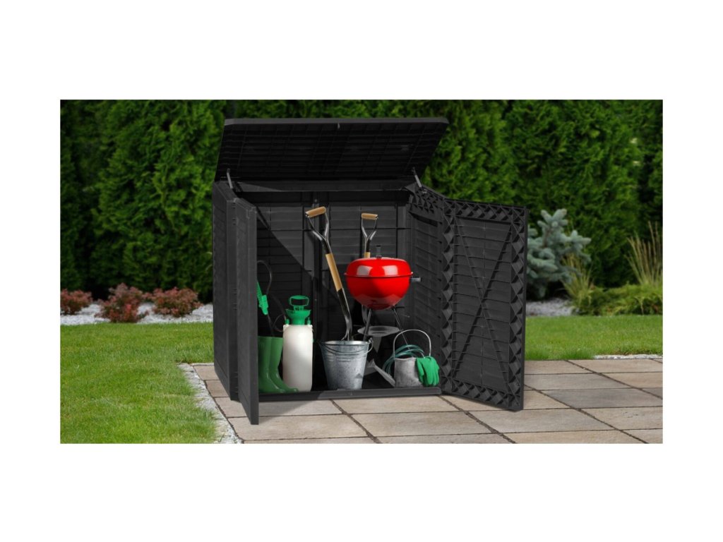 Pevná konštrukcia z materiálu odolného voči poveternostným vplyvom a UV žiareniu zaisťuje odolnosť a spoľahlivosť kontajnera po mnoho sezón. Stabilná spodná doska a rampa navyše uľahčujú skladovanie ťažších predmetov a zároveň zabezpečujú stabilitu celej konštrukcie.